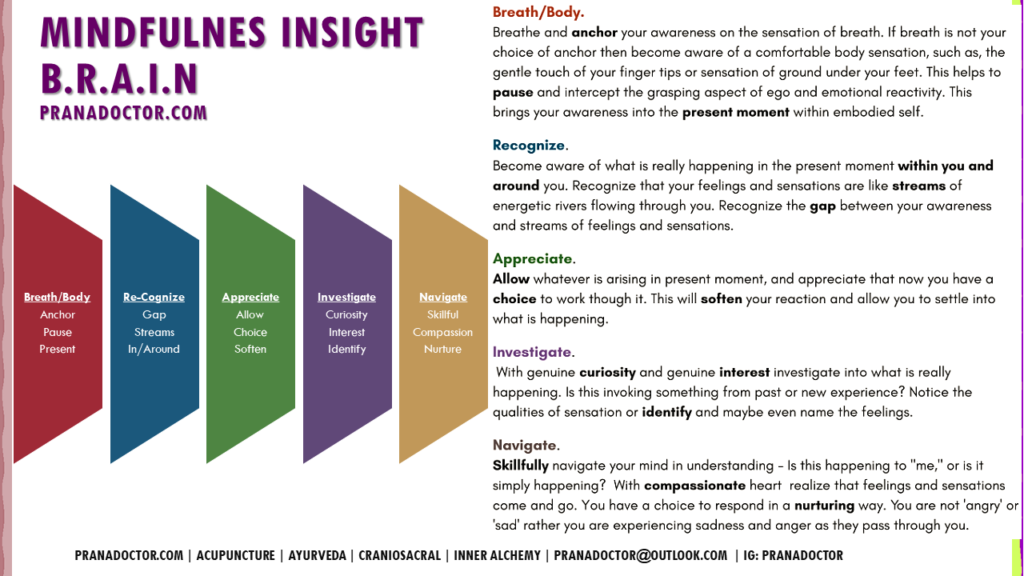 I created five step (B.R.A.I.N) Mindfulness Insight practice to help in resolving suppressed emotions, trauma, or for exploration of deeper states of consciousness.