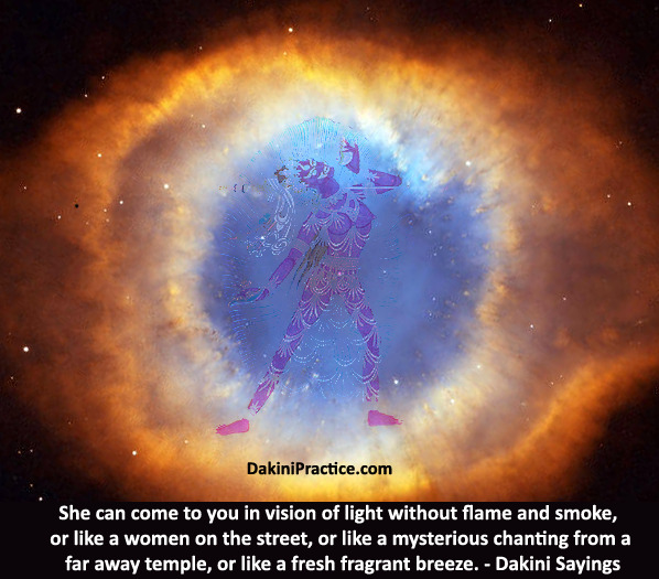 Ḍākinī appears in almost all of the tantric traditions, but the description varies from a magical flying women, young virgin consort, crazy wise old hag, wrathful dark mother, great wisdom energy, and a secret innate pulsating power, that is pushing and guiding us to wakeup from the slumber of samsara. Different traditions have given various names to the innate pulsating wind or ḍākinī: Valley-Spirit, Mother, Breath-of-life, MayaVidya, Yogini, Chiti-shakti, PranaShakti, etc.