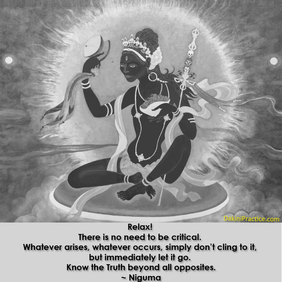 “She is the key, the gate opener, and the guardian of the unconditioned primordial state which is innate in everyone. If I am not willing to play with her, or if I try to force her, or if I do not invoke her, the gate remains closed and I remain in darkness and ignorance. The blade (she carries in hand) cuts through self-clinging, and through the dualistic split into the great bliss. The cutting edge of the knife is representative of the cutting quality of wisdom, the wisdom that cuts through self-deception. One cannot force or grasp a spiritual experience, because it is as delicate as the whisper of the wind.” ~Tsultrim Allione